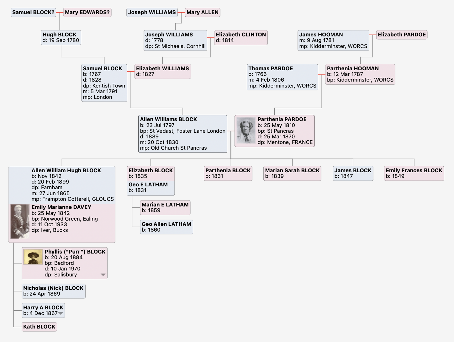 The diagram shows an ‘hourglass’ tree centered on Allen Williams BLOCK and Parthenia PARDOE. The PARDOEs and HOOMANs come from a line of carpet manufacturers in Kidderminster.