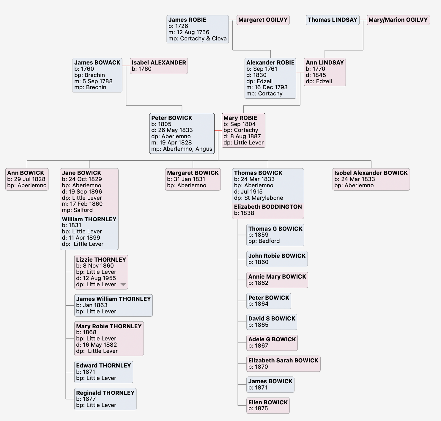 Joan’s great great grandmother was Jane BOWICK. She married William Thornley in Little Lever but the census confirms she came from Angus, although then it would have been Forfarshire, specifically Aberlemno; this village is famous for having Pictish stones in the small graveyard. More about Jane later.