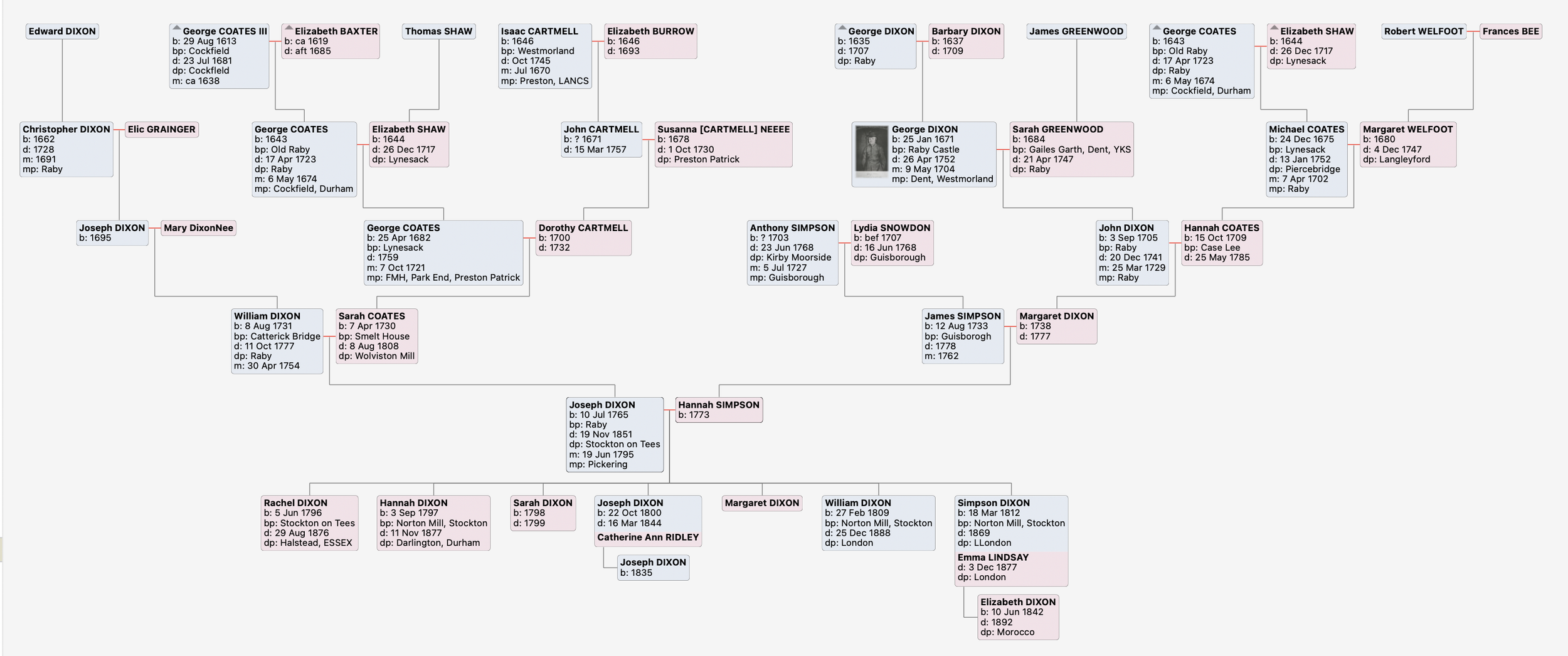 The Dixon family are inter-woven with the COATES, in the sense that two of the nine daughters of Michael COATES and Margaret WELFOOT married two Dixon brothers. This is illustrated in the tree below where both familes can be seen on both sides of the tree. David is descended from Elizabeth COATES, a daughter of Michael COATES and Margaret WELFOOT, and it is Elizabeth’s two sisters Sarah and Hannah who married into the DIXON family, to William and John respectively.
