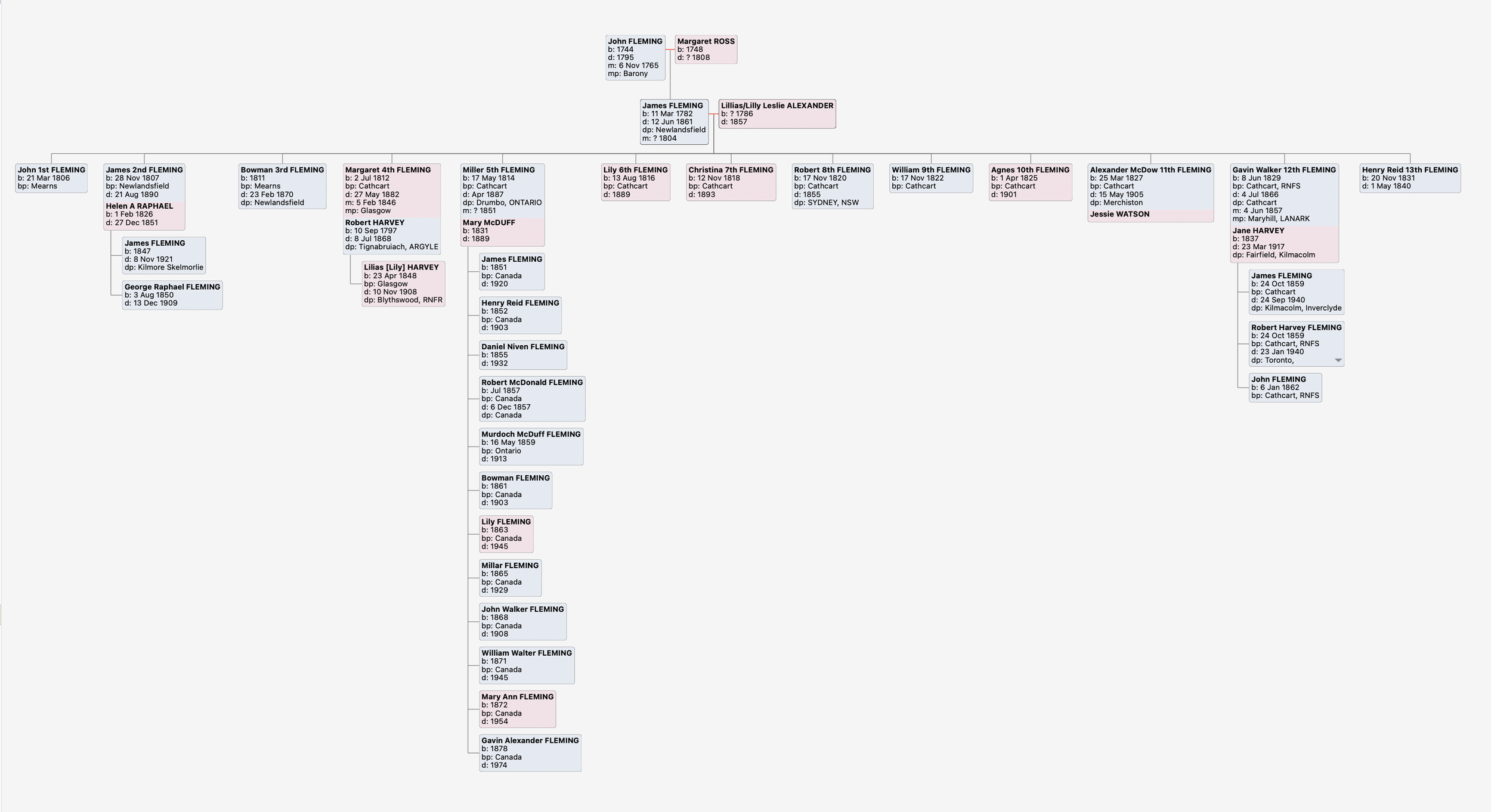 The FLEMING family are interesting, but are intermarried with HARVEY at two points, although at the moment they are not in direct line as ascent for our particular HARVEY branch. They seem to be merchants of various sorts in and around Glasgow, probably starting as farmers in the 1700s. All the ones we have descend from John FLEMING [1744-1795] and Margaret ROSS [1748- ca 1808] and their ten children, as shown in the first tree below. Note that the numbering system up to 13 children for James FLEMING and Lillian/Leslie ALEXANDER are because from the fourth upwards this is noted with the baptism in the documents on Scottish People, which helped a lot in sorting them out.