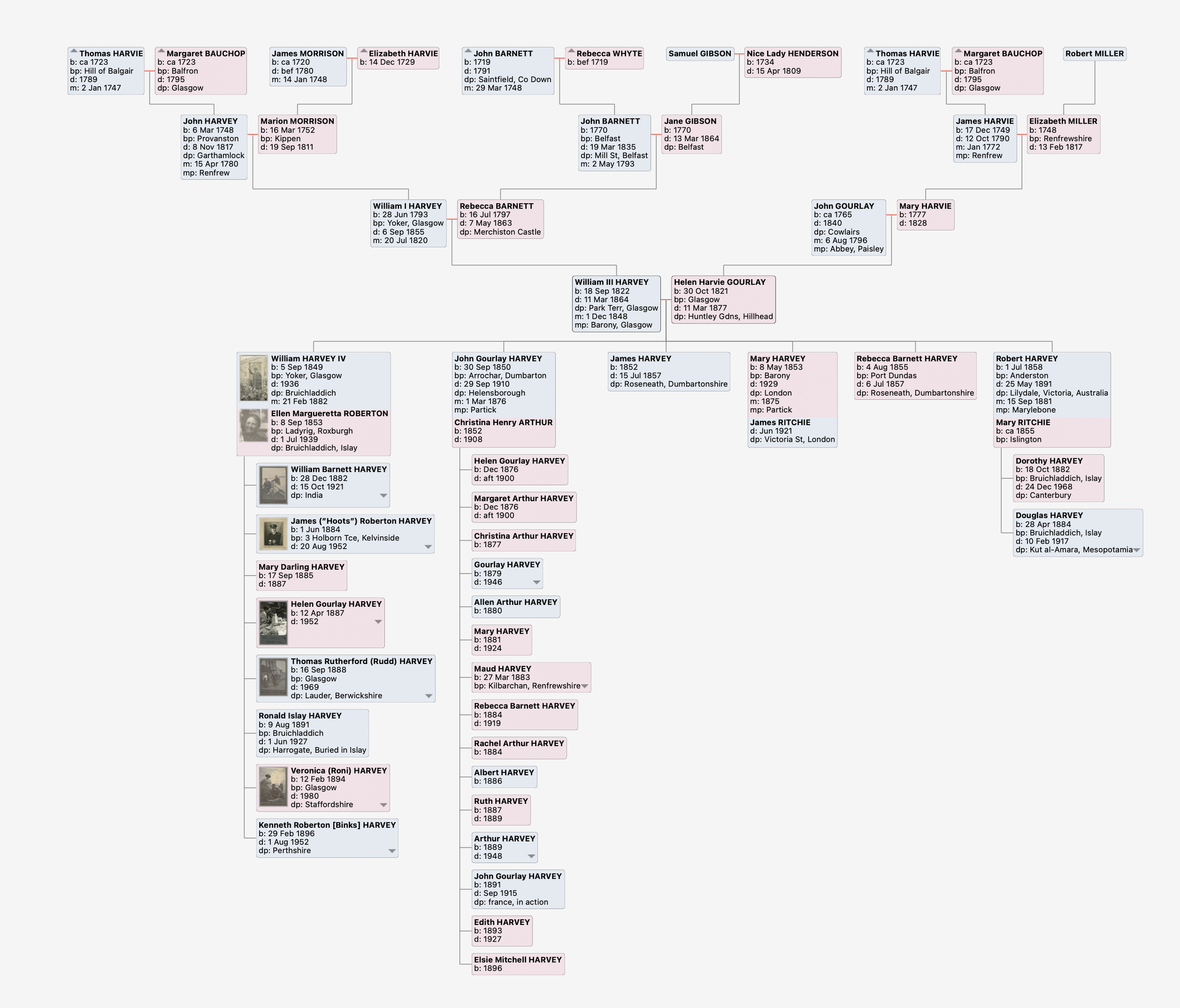 As can be seen from the tree below, William III HARVEY and Helen Harvie GOURLAY had four sons, three of whom survived and went on to found BRUICHLADDICH. William HARVEY and his brothers John Gourlay HARVEY and Robert HARVEY founded this wonderful distillery on the shores of Loch Indaal in Islay in 1881. Their ancestors had previously started distilling at Hill of Balgair in the 1700s, before moving to Glasgow. At various times in Glasgow, branches of the family had distilleries in Paisley, Yoker, Port Dundas and Dundas Hill. William IV and his grandfather William I had been distilling at Yoker on the north bank of the Clyde, while his brothers were also running Dundas Hill in Glasgow, having inherited it on the Gourlay side.