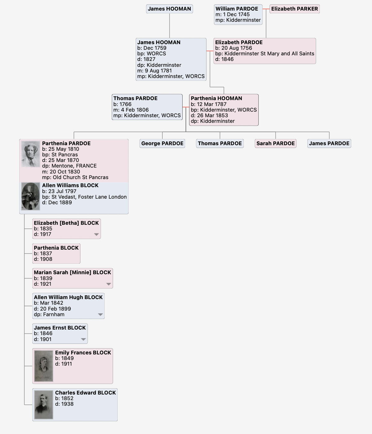This line of the family goes back from BLOCK, where, as seen in the tree, Parthenia PARDOE married Allen WIlliams BLOCK in 1830.