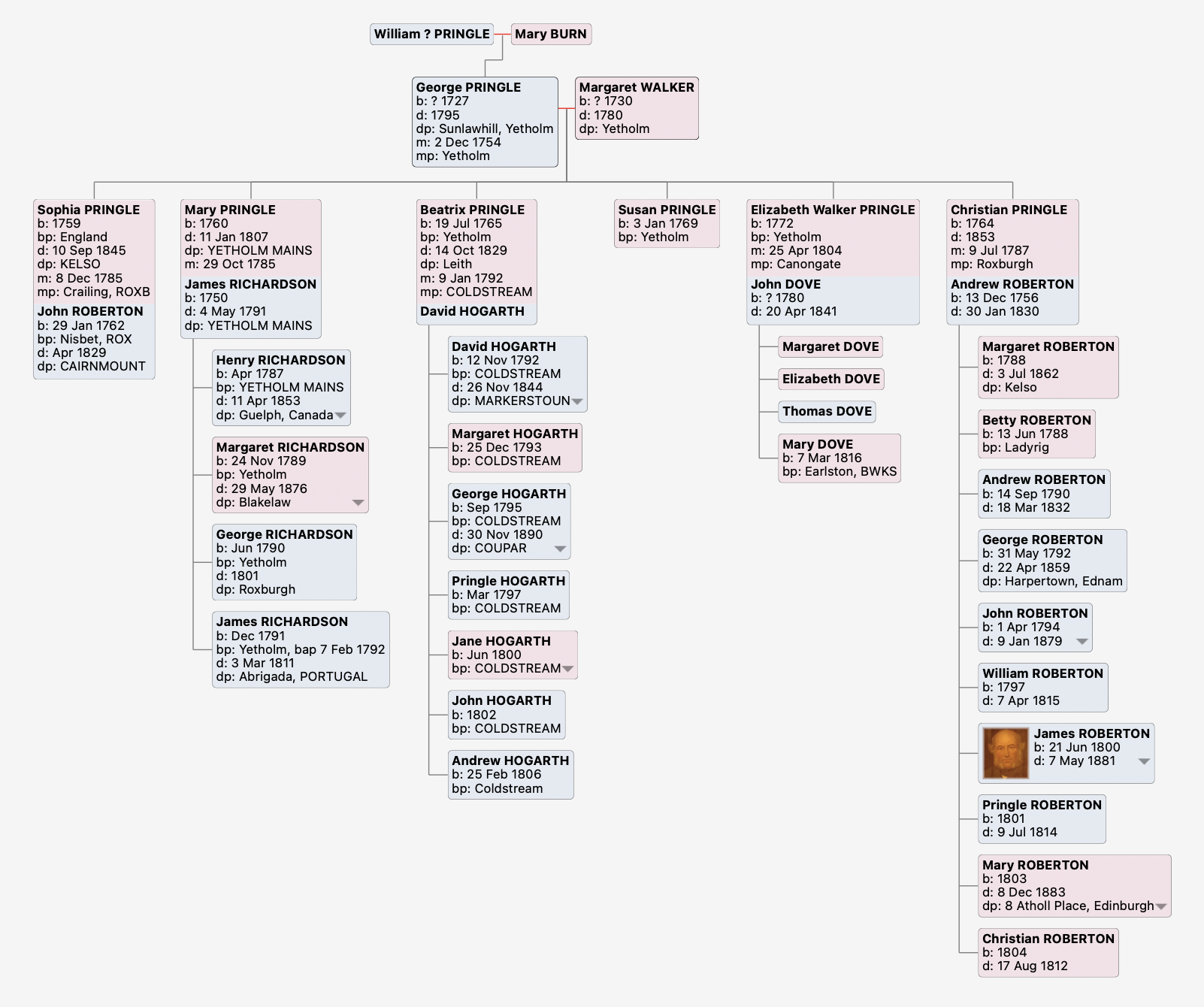 Since George PRINGLE and his wife had only daughters as far as we can see, then the surname ends these, but we have added a generation to show how they relate to the ROBERTON family in the generations shown below. There is also an ‘hourglass’ tree centered on George and Margaret shown below the listed generations.
